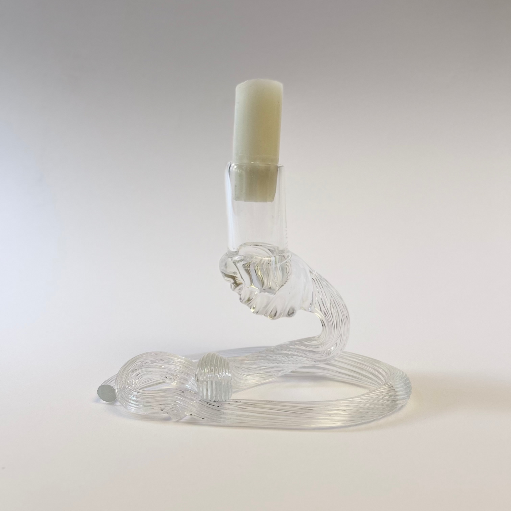 Dekorativ ljusstake i transparent glas, mått ca 15 x 11 cm.