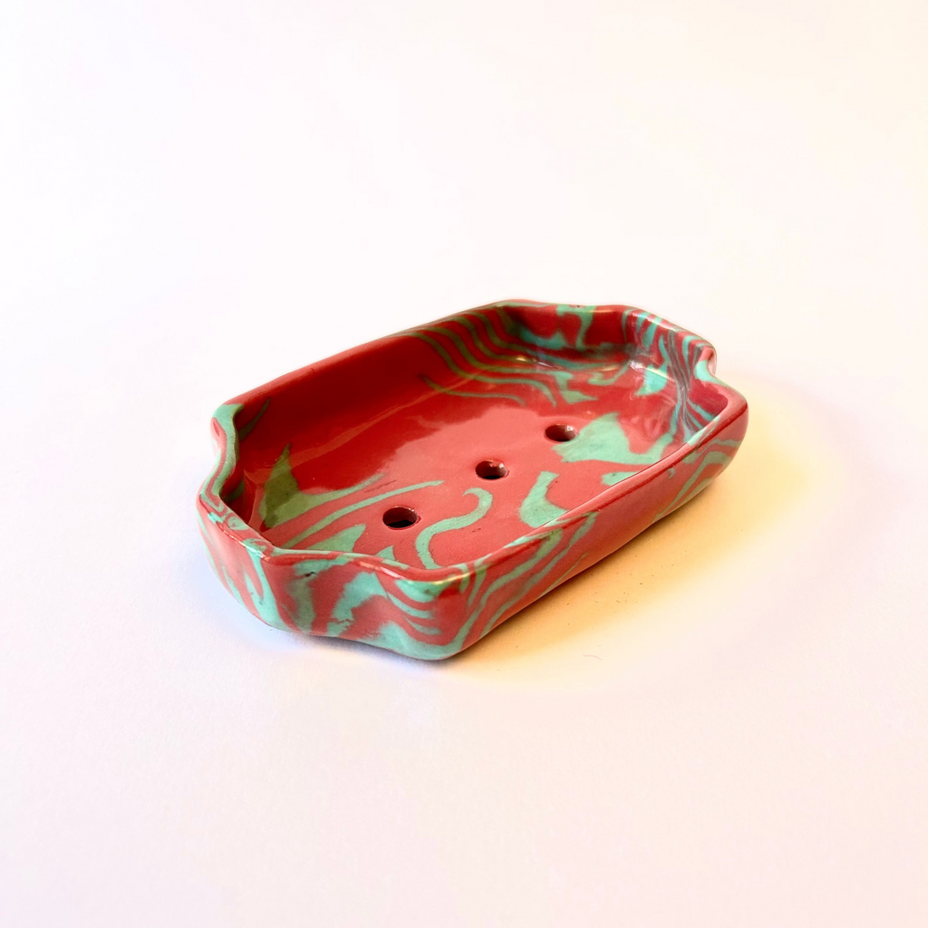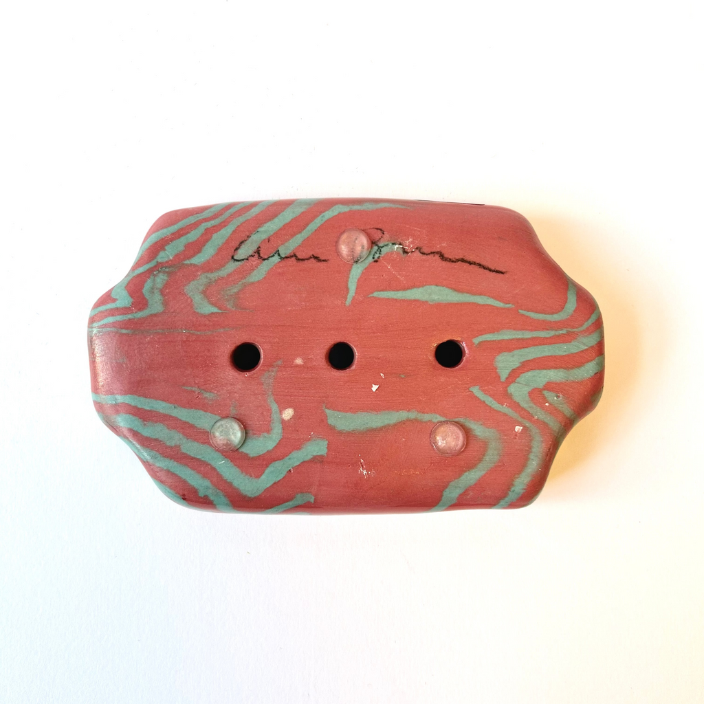 Tvålfat i infärgad porslinslera med silikonkuddar på undersidan för att stå stadigt. Mått ca 12x8 cm.