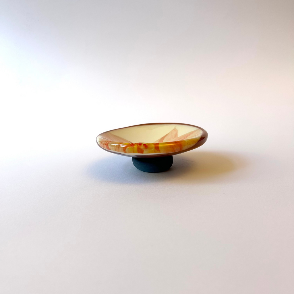 Pralinfat på fot. Lergods, engobe, glasyr och dekaler. Diameter 10,5 , höjd 3,5 cm.