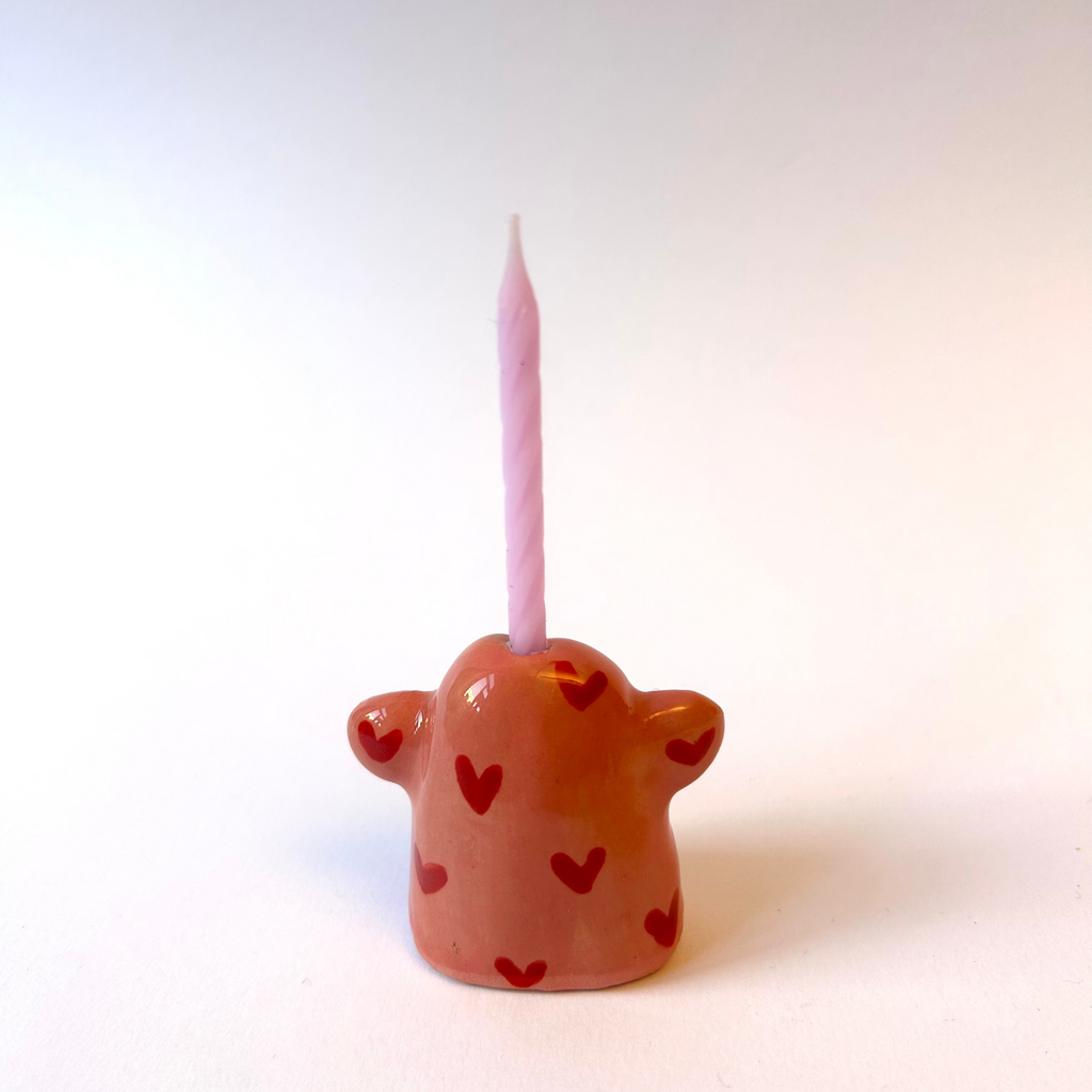 Unik djurskulptur i vit lera dekorerad i olika färger ca 4,5 cm höga, tårtljus i passande kulör ingår.