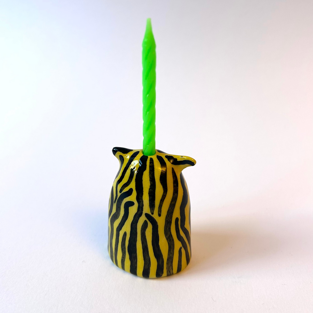 Unik djurskulptur i vit lera dekorerad i många färger ca 5 cm höga, tårtljus i passande kulör ingår.